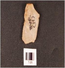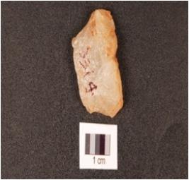 | Description / विवरण | A quartz end scraper, made on flake, visible used wear marks, prepared platform, diffused bulb on ventral surface, smooth surface. |