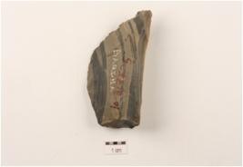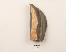 | Description / विवरण | A scraper made on chert with a prepared flat form, use wear marks on working edges, triangular in section. |