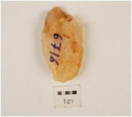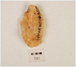 | Description / विवरण | Flake made on quartz, irregular edges, flake scars on surface, uneven in shape. |