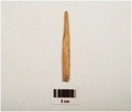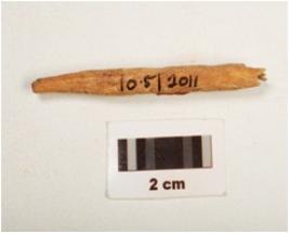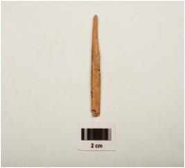 | Description / विवरण | A fragment of bone point, one end pointed, with rough surface, circular cross section. |