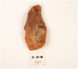 | Description / विवरण | Flake made on chert, ridge on dorsal surface, irregular edges, diffused bulb. |