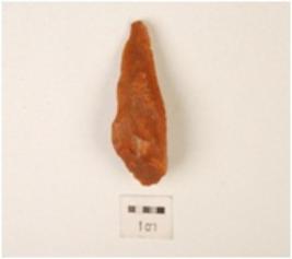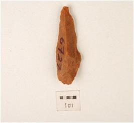 | Description / विवरण | Knife shaped blade, made on chert, ridge on dorsal surface, use wear edges, diffused bulb. |