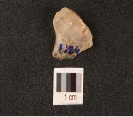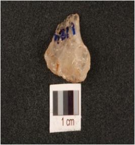 | Description / विवरण | A scraper made on quartz with smooth surface, used wear marks on working edge, diffused bulb. |