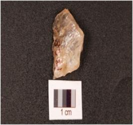 | Description / विवरण | A quartz end scraper, prepared platform, cross flake scars on surface, prominent bulb at distal end, direct pressure technique. |
