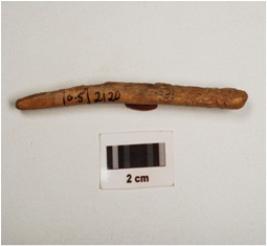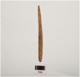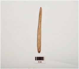 | Description / विवरण | A horn point, partly polished surface with a pointed end, thick at other end, slightly curved, light brown in colour and rectangular in section. |