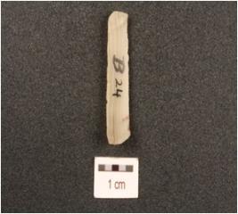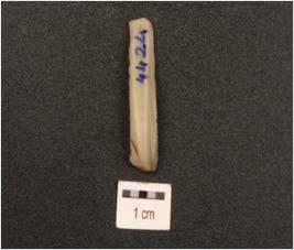 | Description / विवरण | Parallel sided blade, proximal end broken, curved distal end, flake scars on dorsal surface, use-wear marks on both working edge. |