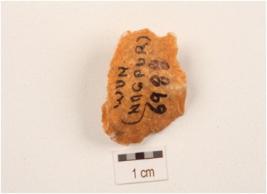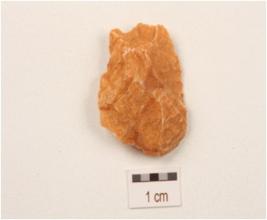 | Description / विवरण | Flake made on side struck chert flake, prominent bulb on ventral surface, flake scars on dorsal surface, use wear marks along cutting edges. |