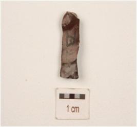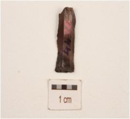 | Description / विवरण | Parallel sided chert blade, prominent bulb with striking platform, two vertical ridges on dorsal surface, use-wear marks on both working edges distal end broken. |