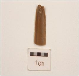 | Description / विवरण | Parallel sided chert blade, distal end broken, prominent bulb with striking platform, blade scars on dorsal surface, use-wear marks on both working edges. |