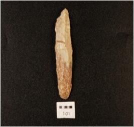 | Description / विवरण | A flake made on chert, flake scars on dorsal side, proximal end on bulb, triangular section, shark cutting edge. |