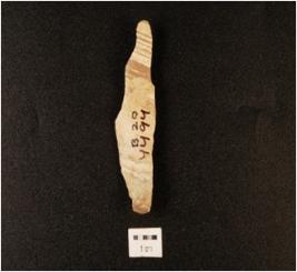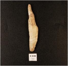 | Description / विवरण | A flake made on chert, flake scars on dorsal side, proximal end and bulb difussed, along cutting edge, triangular section. |
