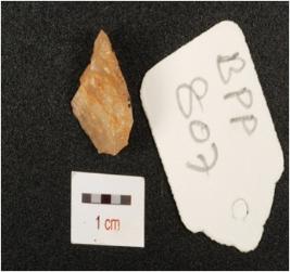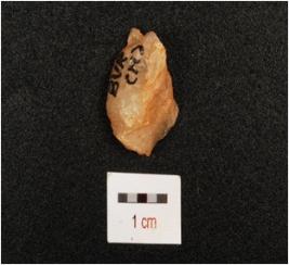 | Description / विवरण | Flake made on quartz. Prepared platform on proximal end. Diffused bulb on ventral side, use wear mark along cutting edges. |