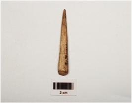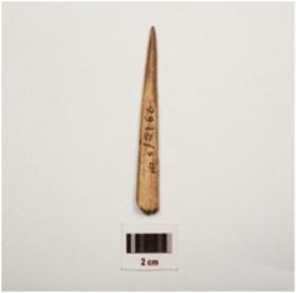| Description / विवरण | Fragment of a bone point, partly polished surface with a pointed end, broken from other end, light brown in colour and rectangular in section. |