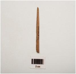 | Description / विवरण | A bone point with slightly broken pointed end, polished surface, partly broken from other end and brown in colour. |