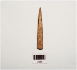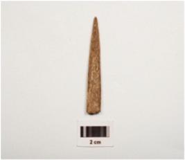 | Description / विवरण | Fragment of a bone point, partly smooth and uneven surface, one pointed and, partly broken from other end, brown in colour and rectangular in section. |