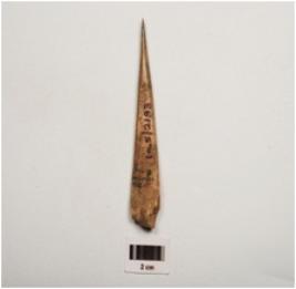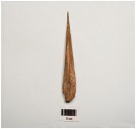 | Description / विवरण | A bone point, polished surface with a pointed end, partly broken from thick end and brown in colour. |