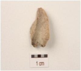 | Description / विवरण | Flake made on chert with a ridge on dorsal side and bulb on ventral side, use-wear marks along cutting edges, triangular in section. |