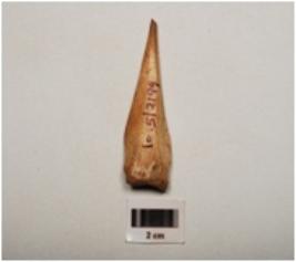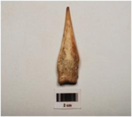 | Description / विवरण | A bone spear point, polished surface with partly broken pointed end, thick and broad at other end and light brown in colour. |