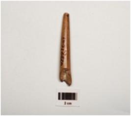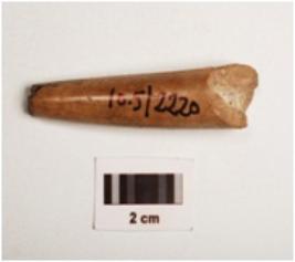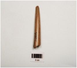 | Description / विवरण | A bone point, polished surface with vertical crack marks, partly broken from both ends and dark brown in colour. |
