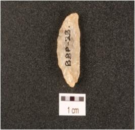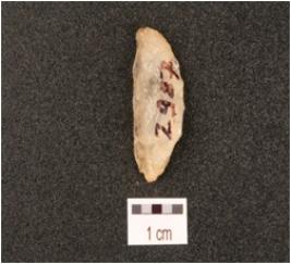 | Description / विवरण | A lunate made on quartz with smooth surface, used wear marks along edges. |
