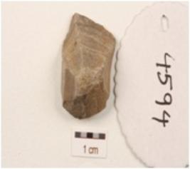 | Description / विवरण | Flake made on end struck chert, chipped surface on dorsal side and prominent bulb on ventral side, use-wear marks along cutting edges. |