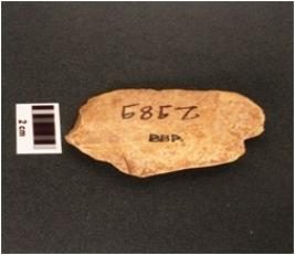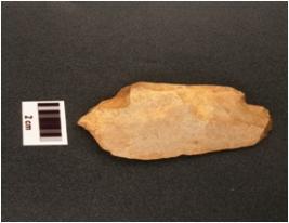 | Description / विवरण | A scraper made on chert with smooth surface, used wear marks on working edges, flake scars on surface. |