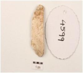 | Description / विवरण | Single sided blade made on chert with use-wear marks on cutting edge, mid-ridge on dorsal side and diffused bulb on ventral side. |
