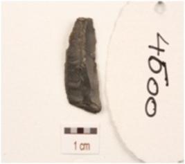 | Description / विवरण | Blade made on chert with ridge on dorsal side and promient bulb on ventral side, use-wear marks on along cutting edges. |