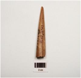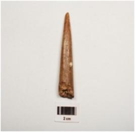 | Description / विवरण | A point, polished surface with vertical crack marks, pointed at one end, partly broken at other, end, hollow from within and dark brown in colour. |