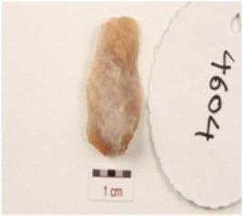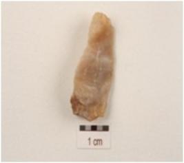 | Description / विवरण | Flake made on chert with a ridge on dorsal ridge and prominent bulb on ventral side, use-wear marks along cutting edges. |