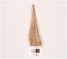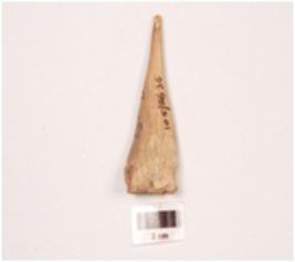 | Description / विवरण | Awl with a pointed end, other end broad and porous, polished surface, cut marks visible on surface. |
