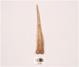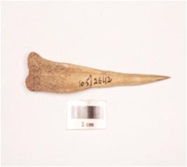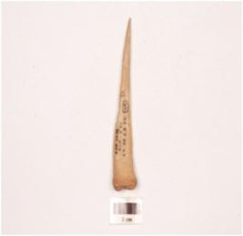 | Description / विवरण | Bone point pointed one end and broad at other, polished surface, broad end has porous surface. |