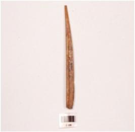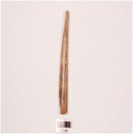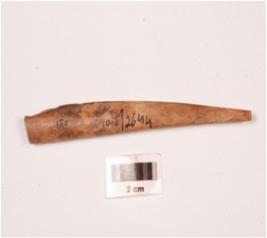 | Description / विवरण | Bone point with a polished surface, pointed end, hollow surface visible on one side, cut marks visible on surface. |