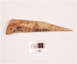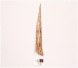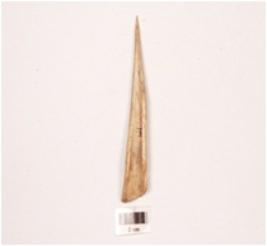 | Description / विवरण | Bone point with a polished surface, pointed tip, broad at other end, one side hollow, cut marks on surface visible. |