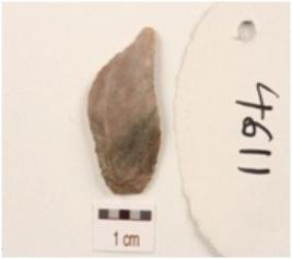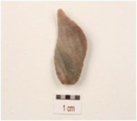 | Description / विवरण | Flake made on chert with two ridges on dorsal side and prominent bulb on ventral ridge, use-wear marks along cutting edges. |