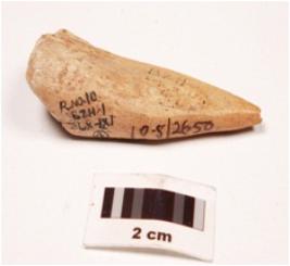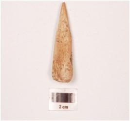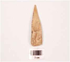 | Description / विवरण | Bone arrow head with a pointed tip and broad at other end, cut marks visible on surface, polished surface. |