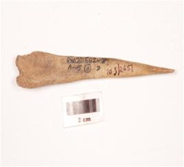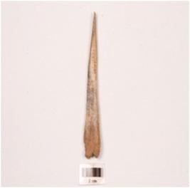 | Description / विवरण | Bone point with one end pointed, other end flat and broad, roughly rectangular cross section, cut marks visible on surface. |