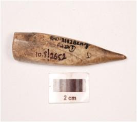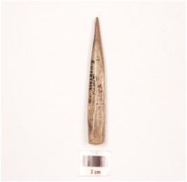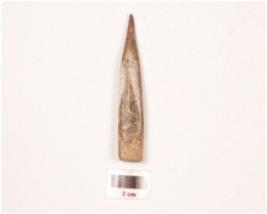 | Description / विवरण | A bone point with a broken pointed end, smooth surface, some cut marks visible on surface, rectangular in cross section, a crack visible on surface. |