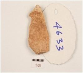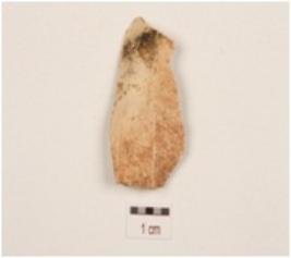 | Description / विवरण | A blade made on a end struck chert flake, parallel side, prepared platform, double ridged, prominent bulb on ventral side, visible used wear marks. |