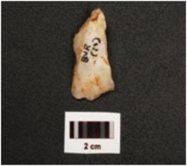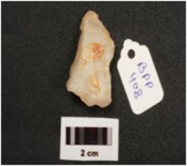 | Description / विवरण | A quartz flake with flake scars on surface and use on edges. |