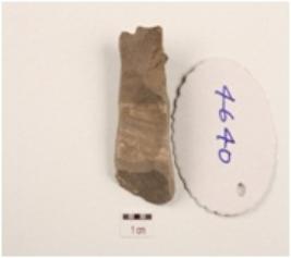 | Description / विवरण | An end scraper made on a chert core, prepared platform, prominent bulb on ventral side, cross flake scars on surface, visible used wear marks. |