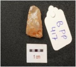 | Description / विवरण | A fragment of a flake, irregular shaped and use wear marks on edges. |