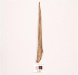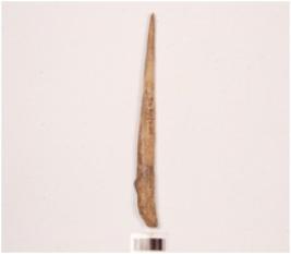 | Description / विवरण | Bone point with pointed on one end and broad on other end. Polished surface, hollow surface of bone narrow visible on one side. |