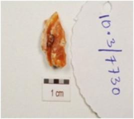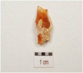 | Description / विवरण | A chalcedony flake with cortex on surface and flattened section. |
