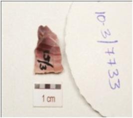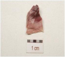 | Description / विवरण | A chert flake with flake scars on surface, flat section and broken along one end. |