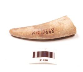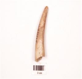 | Description / विवरण | Modified bone core with one end pointed other end broad, porous interior. Broken at broader end. |