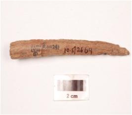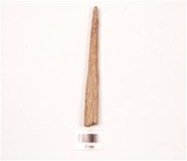 | Description / विवरण | Bone point with one end pointed other end broad, roughly rectangular cross section, polished surface, cut marks visible, wards the pointed side. |