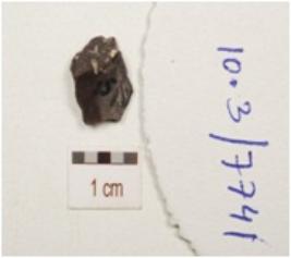 | Description / विवरण | Fragment of chert blade with mid ridge on dorsal, triangular section, use wear marks on cutting edge and broken along both ends. |