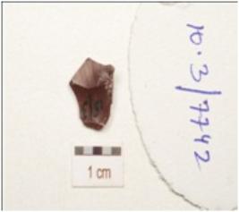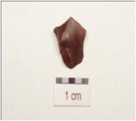 | Description / विवरण | Fragment of chert blade with prominent mid ridge on dorsal, prepared platform and bulb on ventral, triangular in section, use wear marks on cutting edge and broken along distal end. |