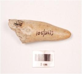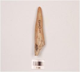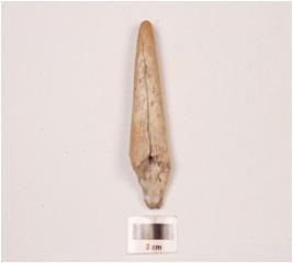 | Description / विवरण | Horn point with a polished surface, slight weathering marks visible on surface, one side used for polishing some objects, pointed at one end and broken at other end. Vertical crack visible on surface. |